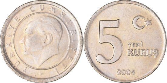 | | Coin, Turkey, 5 New Kurus, 2005, Istanbul, , Copper-Nickel-Zinc | | | Head of Atat, Value | | FEATURES |