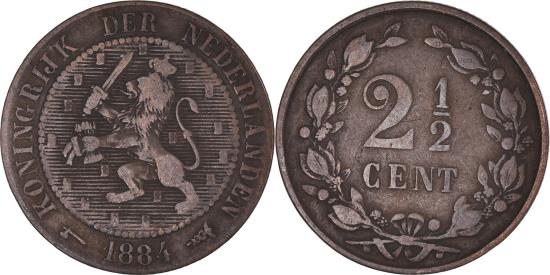 | | Coin, Netherlands, William III, 2-1/2 Cent, 1884, , Bronze, KM:108.1 | | | Crowned rampant lion, left, within beaded circle, date below, Value within wreath, Privy mark: Broadaxe, KONINGRIJK DER NEDERLANDEN | | FEATURES |
