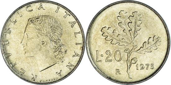 | | Coin, Italy, 20 Lire, 1975, Rome, , Aluminum-Bronze, KM:97.2 | | | Wheat sprigs within head left, Oak leaves divide value and date | | FEATURES |