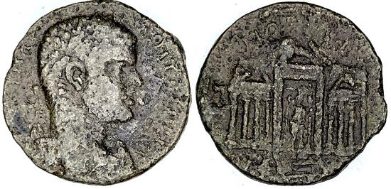 TCGKPB-31, PHOENICIA TRIPOLIS, AE 9.37 gm 25 mm. Obv: ELAGABALUS bust right. Greek letters between bust and rim. Rev: TEMPLE with Greek letters above and letters in ex. as well. 218-222 AD gF