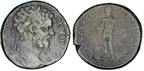 TCGKPB-72A, NICOSIA, NICOPOLIS AD ISTRUM, AE 13.48 gm 26.52. Obv: SEPTIMUS SEVERUS bust right, Rev: TYCH STANDING, Holding a plant and sacrificing over the fire, Greek letters between the bust and rim. VERB-268. VF. |
