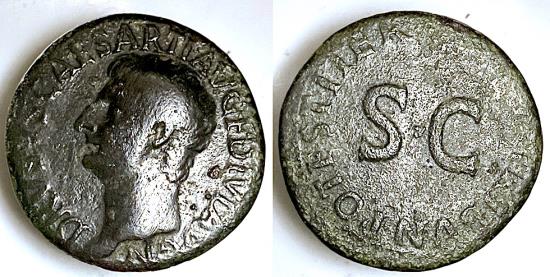 TCRIB-341, DRUSUS, AE 10.19 gm AS. Obv: DRUSUS son of TIBERIUS, bust left. DRUSUS CAESAR TI AVG F DIVI AVG N around the bust. Rev: SC in the center, PONTIFF TRIBVN POTEST ITER around and inside rim. 21-22 AD. RSC-2, RIC-45 gF