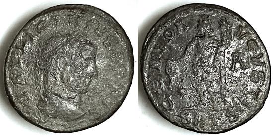 TCRIB-304, LICINIUS, AE5.99 gm 26.9 mm AS, Obv: VAL LICINIVS PF AVG, Laurette head right. Rev: GENIO AVGVSTI, GENIUS standing left and holding a cornucopia and poleria. 308-324 AD. RIC 306. VF. THIS COIN WOULD BENEFIT FROM A LONG SOAKING IN DISTILLED WATER AS THE COIN IS NICE BUT HAS A SURFACE CRUD.