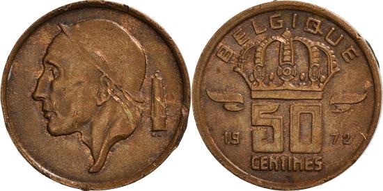 | | Coin, Belgium, Baudouin I, 50 Centimes, 1972, , Bronze, KM:148.1 | | | Crowned denomination divides date, legend in French, Helmeted mine worker left, miner's lamp at right, large head, tip of neck 1/2 mm from rim, BELGIQUE | | FEATURES |