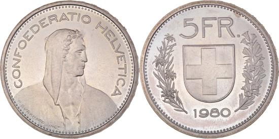 | Coin, Switzerland, 5 Francs, 1980, Bern, Proof, , Copper-nickel |
