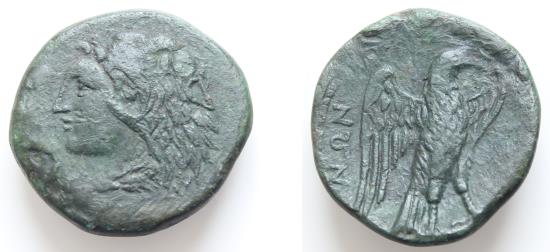 | Sicily, Messana, The Mamertinoi, c. 275-264 BC. Æ Double Unit (24mm, 10.1g, ). Head of Herakles l., wearing lion-skin. R/ Eagle standing l. on thunderbolt, wings open. CNS -; HGC 2, 867 var. (eagle r.). Rare, near Good Very Fine Nice green Patina |