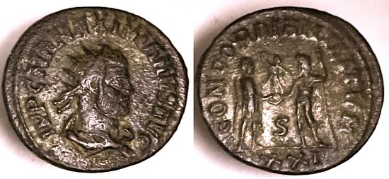 TCRIB-345, MAXIMIANUS, AE 2.95 gm ANT, Obv: IMP CMA MAXIM IANUS PF AVG, Radiant bust right. Rev: CONCORDIA MILITUM, CONCORDIA MEETING MAXIMIANUS. S in the field between men. -XXI in ex. ANTIOCH MINT. RIC-607. gVF