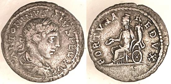 TCRIS-314, Elagabalus AR 3.29 gm 19 mm, Obv: ANTONINVS PIVS FEL AVG, Laureate, draped bust right. Rev: FORTUNA seated left, holding patera and cornucopia, wheel under chair. Antioch Mint. RIC-189. gVF