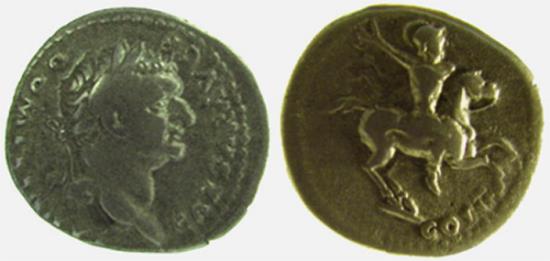 TCRIS-59, DOMITAN, AR 3.21 gm Denaruis Obv: CAESAR AVG F DOMITIANUS, Bust right. Rev: COS V, Horseman riding right hand raised RIC-242.aVF