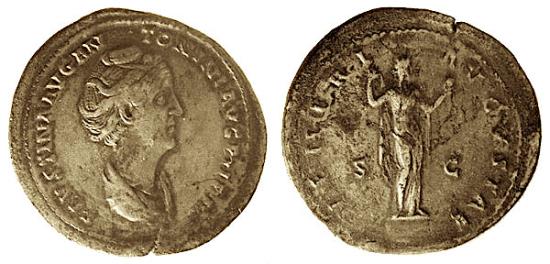 | TCRIB-215, FAUSTINA SENIOR, RARE LIFETIME ISSUE, MEDALIC FLAN, AE 23.68 gm, Obv: FAUSTINA AVG ANTONINI AVG P II PP, Draped bust to right. Rev: VENERI AVGUSTAE, VENUS STANDING RIGHT HOLDING APPLE WHILE DRAWING UP ROBE FROM SHOULDER. SC ACROSS FIELD. S-4677, RIC-1081. aXF. |