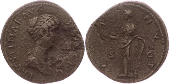 TCRIB-95, FAUSTINA Junior AE, 22.5 gm 31 mm Sestertius, 146-148 Obv: FAUSTIN AE P II AVG PIL Faustina's Bust is Right; however, her face has been damaged.Rev: Venus Stands left, holding an apple and rudder around which a dolphin is coiled RIC-1387. VF, except for facial obliteration.