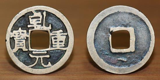 Chinese AE Coin, Emperor Su Zong (756-62), Qian Yuan Zhong Bao, Crescent below.