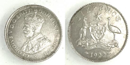 TCWAU-22, AUSTRALIAN 6d, AR, COAT OF ARMS, 1922, EF