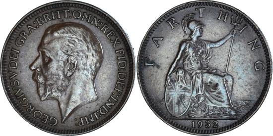 | | Coin, Great Britain, George V, Farthing, 1932, , Bronze, KM:825 | | | Head left, modified effigy, Britannia seated right, Bertram MacKennal | | FEATURES |
