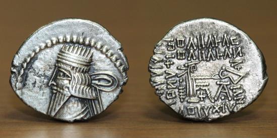Kings Of PARTHIA, Pakoros I. AR drachm, Ekbatana mint, circa AD 78-120 Obv: Diademed and draped bust left, long pointed beard. Rev: Archer seated right on throne depicted as a line, holding bow; monogram "A" below bow. Weight: 3.50gm, Size: 20.8mm XF, Toned.