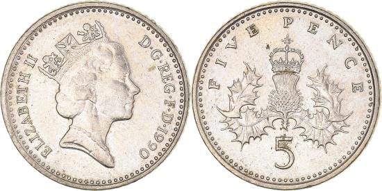 | | Coin, Great Britain, Elizabeth II, 5 Pence, 1990, , Copper-nickel | | | Crowned head right, Crowned thistle, Reduced size. Varieties in thickness and edge milling exist., Raphael Maklouf | | FEATURES |