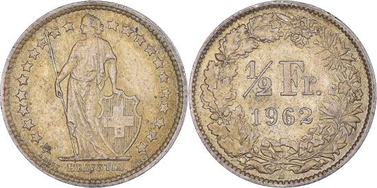 | | Coin, Switzerland, 1/2 Franc, 1962, Bern, , Silver, KM:23 | | | Standing Helvetia with lance and shield within star border, Value, date within wreath | | FEATURES |