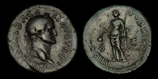 Galba (68-69), AE Sestertius October - November AD 68, Rome mint. Obverse: IMP SER GALBA CA ES AVG TR P, laureate and draped bust facing right. Reverse: LIBERTAS PVBLICA, Libertas standing, holding pileus and cradling vindicta. 25.82 grams, 34 mm in diameter. RIC 387; SEAR V.1, 2118. Some peripheral striking softness, otherwise the portrait very bold, practically very fine, with a pleasing rich dark patina, most attractive in the hand, a rare coin from a very short-lived Emperor. |