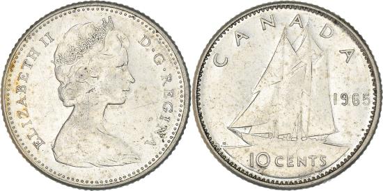 | | Coin, Canada, Elizabeth II, 10 Cents, 1965, Royal Canadian Mint, Ottawa | | | Young bust right, Bluenose sailing left, date at right, denomination below, Arnold Machin | | FEATURES |