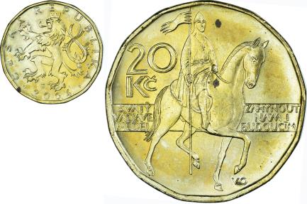 | | Coin, Czech Republic, 20 Korun, 2004, , Brass plated steel, KM:5 | | | Crowned Czech lion left, date below, St. Wenceslas (Duke Vaclav) on horse, Two varieties of mint marks and style of 9's exist for 1997. | | FEATURES |