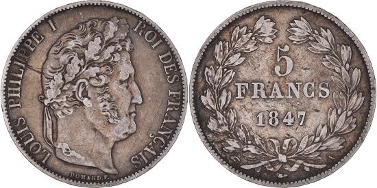 | | Coin, France, Louis-Philippe, 5 Francs, 1847, Paris, , Silver | | | Louis-Philippe, Laureate head right, Mint marks at edge outside wreath, LOUIS PHILIPPE I ROI DES FRANCAIS | | FEATURES |