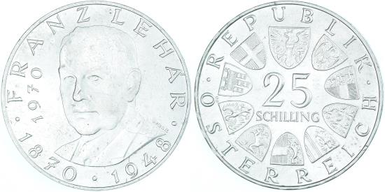 | | Coin, Austria, 25 Schilling, 1970, , Silver, KM:2907 | | | Value within circle of shields, Head of Franz Lehar, 3/4 left, date to the left, two dates below | | FEATURES |