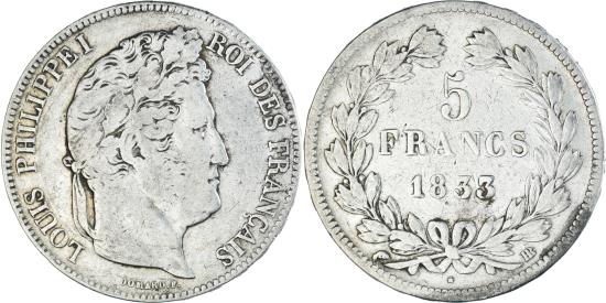 | | Coin, France, Louis-Philippe, 5 Francs, 1833, Strasbourg, , Silver | | | Louis-Philippe, Laureate head right, Mint marks at edge outside wreath | | FEATURES |