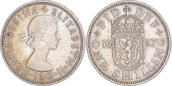 | | Coin, Great Britain, Elizabeth II, Shilling, 1957, , Copper-nickel | | | Laureate bust right, Crowned English shield divides date, without BRITT OMN Mary Gillick | | FEATURES |
