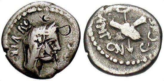 Mark Antony. 39 B.C. AR quinarius. Military mint travelling with Octavian in Gaul. Toned Fine, bankers' marks.