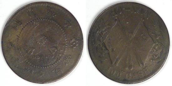 Obv: Wreath with flower at centre, left, and right, all with Chinese ideograms above “Republic of China” and below “Worth 100 Cash Copper coin”