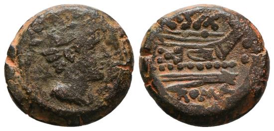 C. CLUVIUS SAXULA. AE, Sextans. 69-158 BC. Rome. Obv/ Head of Mercury right, two pellets above. Rev/ Prow right, C SAX ligate above, two pellets before, ROMA below. Cat: Crawford 173/5. Bronze (Ae) 6,00g - 18mm. Very rare. Badly minted obverse but its reverse is magnificent. |