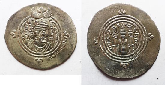 and four pellets / Fire altar with facing attendants; to l., date; to r., mint name. Malek 178.