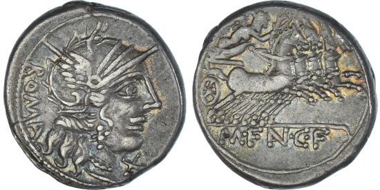 | | Fannia, Denarius, 123 BC, Rome, Silver, , Crawford:275/1 | | | Roma head to right with winged helmet., Victoria in Quadriga to right., M. Fannius. Very nice specimen, covered with a beautiful patina of a slightly bluish gray. Supplied with its old pouch., ROMA / X, M·F N·C·F | | FEATURES |