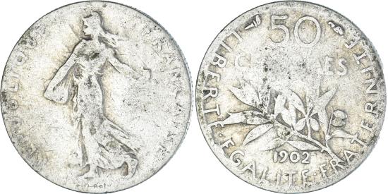 | | Coin, France, Semeuse, 50 Centimes, 1902, Paris, , Silver, KM:854 | | | Semeuse, Figure sowing seed, Leafy branch divides date and denomination, Without mint mark. | | FEATURES |