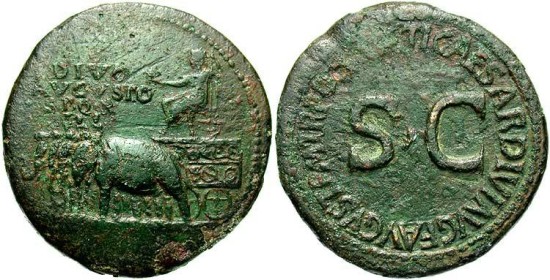 Augustus. 27 B.C.-A.D. 14. � sestertius (34 mm, 25.77 g). Rome, posthumously under Tiberius. Statue of Augustus seated left on throne set on ornate car drawn by four elephants; each elephant has its own mahout / Legend around large S C. RIC 56, 62 or 68. VF, green patina, rough.
