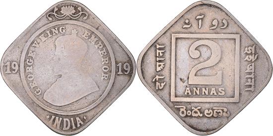 | | Coin, INDIA-BRITISH, George V, 2 Annas, 1919, , Copper-nickel, KM:516 | | | Crowned bust left within circle, Large denomination within square, Calcutta Mint issues have no mint mark. Bombay Mint issues have a small raised dot on the reverse at the bottom near the rim., GEORGE V KING EMPEROR | | FEATURES |