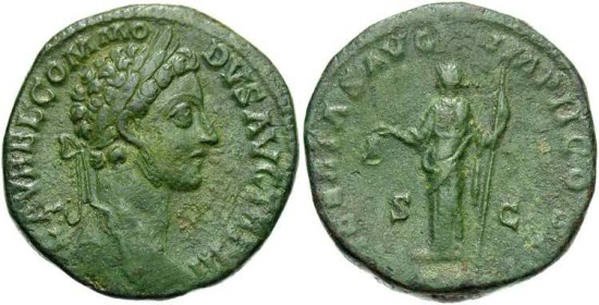 Commodus. A.D. 177-192. � sestertius (21.24 g). Rome, A.D. 178. Laureate head right / Libertas standing left, holding pileus and scepter. RIC 1598. VF, green patina.