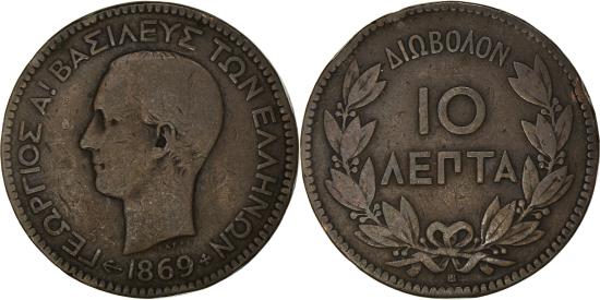 | | Coin, Greece, George I, 10 Lepta, 1869, Strassburg, , Copper, KM:43 | | | Young head left, Denomination within wreath | | FEATURES |