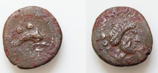 | LUCANIA, Paestum (Poseidonia). Second Punic War. 218-201 BC. Quadrans AE20mm, 5,7 g, Diademed head of bearded male right; three pellets (mark of value) to left / Dolphin |