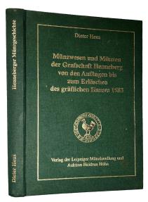 Münzwesen und Münzen der Grafschaft Henneberg von den Anfängen bis zum Erlöschen des gräflichen Hauses 1583 by Dieter Heus, Leipzig, 1999, 358 pages, text illustrations, decorated green cloth. Near New