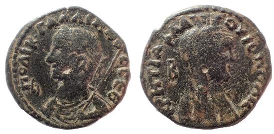 Creteia-Flaviopolis, Gallienus (253-268). Ae 25 mm. 11.3 gm. Obv: AYT K ΓAΛΛIHNOC CEB, laureate and draped bust left, right hand raised, holding spear in left hand. Rev: KPHTIA ΦΛΑVΙΟΠOΛC, veiled and turretted bust of Tyche right. Waddington 339,42, Sear 4541. Rare.