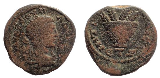 Cappadocia. Caesarea. Severus Alexander AD 222-235. Dated Year 7=AD 228/9 Bronze Æ 22mm. 6.4 gm. Obv: AV K CЄOV AΛЄZAN, radiate, draped and cuirassed bust right. Rev: MHTP KAICA, kalathos containing four ears of corn, ET Z (date) below. very fine BMC Cappadocia, pg.91, 333 var. (obverse legend).