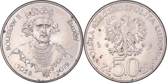| | Coin, Poland, 50 Zlotych, 1981, Warsaw, , Copper-nickel, KM:124 | | | Imperial eagle above value, Crowned bust of King Boleslaw II Smialy 1/4 right | | FEATURES |