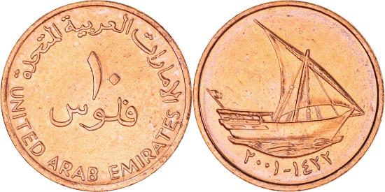 | | Coin, United Arab Emirates, 10 Fils, 2001/AH1422, British Royal Mint, | | | Value, Arab dhow above dates, Reduced size. | | FEATURES |