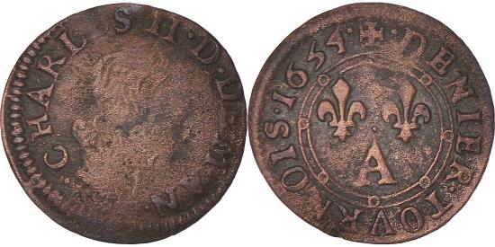 | Coin, France, CHARLES II DE GONZAGUE, Denier Tournois, 1654, Charleville |