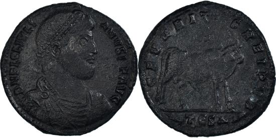 | | Coin, Julian II, Maiorina, 361-363, Thessalonica, , Bronze, RIC:225 | | | Diademed, draped and cuirassed bust of Julian II to right., Bull standing right; above, two stars. | | FEATURES |