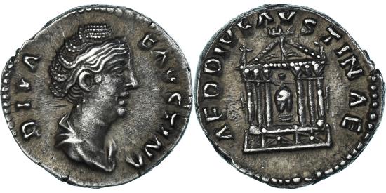 | | Coin, Diva Faustina I, Denarius, 141, Rome, , Silver, RIC:III-343 | | | Draped bust to right., Hexastyle temple with figure of Faustina seated within., Superb old grey cabinet toning., DIVA FAVSTINA, AED DIV FAVSTINAE | | FEATURES |