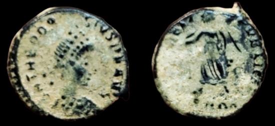 Theodosius I. AE4 383-392 AD. Uncertain mint (Constantinople?). DN THEODO-SIVS PF AVG, pearl diademed, draped and cuirassed bust r. / SALVS REPVBLICAE, Victory dragging captive, trophy on shoulder. Uncertain symbol l. field. CONS_?. 13mm, 1.35g. RIC IX. Cf. Constantinople 86b/90a.