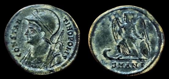Commemorative Series. AD 330-354. Æ Follis 17mm, 3.00g. Antioch mint, 10th officina. Struck AD 335. Laureate and helmeted bust left of Constantinopolis, wearing imperial mantle, holding reversed spear / Victory standing left on prow, holding spear and resting hand on shield. RIC VII 92.