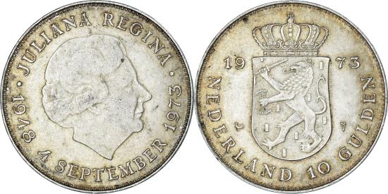 | | Coin, Netherlands, Juliana, 10 Gulden, 1973, , Silver, KM:196 | | | Head right within beaded border, Crowned arms divide date within beaded border | | FEATURES |